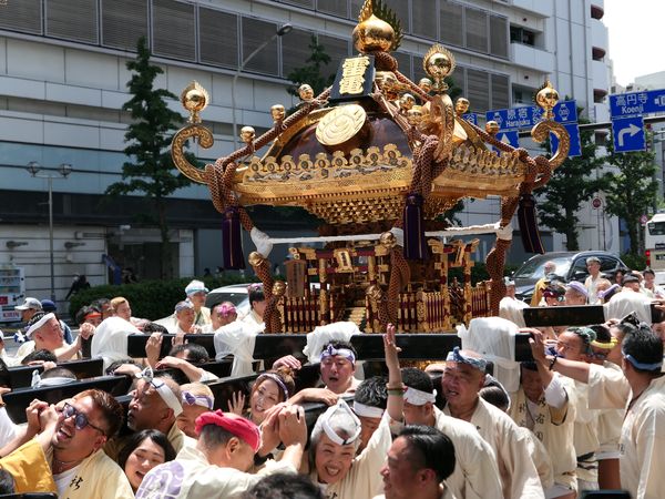 Un peu après 10 h, des bénévoles en costumes feront leur apparition, un mikoshi sur l’épaule, porté par des hommes et des femmes au front ceint d’un hachimaki. Puis c’est au tour d’un char tracté à l’aide de deux cordes tressées rouges et blanches, et renfermant des musiciens, de faire son apparition. Un homme est alors présent sur son toit, afin de s’assurer que le véhicule s’immisce sans heurt entre les câbles électriques et le mobilier urbain. Ensuite, un saruta-hiko, une divinité shintoïste représentée sous les traits d’un tengu, habillé d’un vêtement soyeux orangé et mordoré, ainsi que deux plateformes exhibant deux têtes léonines dorées, défileront devant nous.