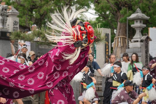 L’événement débute le samedi vers 13 h 30 avec une danse appelée shishimai, mettant en scène un couple de « lions ». Deux hommes déguisés, revêtant des masques, exécutent alors des pas de danse et des acrobaties devant le hall principal du sanctuaire Fuji Hachiman. Tout autour d’eux, des enfants en costumes traditionnels marchent en cercle, reproduisant une chorégraphie dynamique. Puis c’est enfin au tour des volontaires — tous des hommes habillés en haori, un hachimaki ceint autour du front — d’empoigner les mikoshi, ces autels dorés sacrés, et de quitter la sacrosainte enceinte.