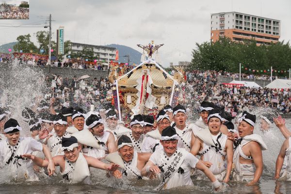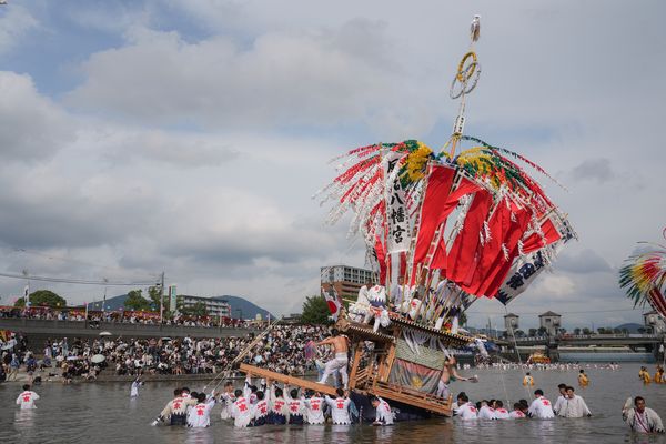 Là, sur la rive, les chars se rassemblent les uns à la suite des autres, arrivant doucement au gré des pas de leurs porteurs. Et vers 15 h-15 h 30, c’est enfin l’heure de la traversée ! Les mikoshi s’élancent par conséquent dans l’onde calme de la rivière, bientôt suivis par les chars décorés. Chaque passage d’un yamakasa donne alors lieu à des cris et à des éclaboussures. Les volontaires secouent d’ailleurs les chars, les faisant basculer d’avant en arrière, pendant la traversée, avant de s’arrêter pour prendre une photographie commémorative ! Aussitôt le cliché pris, tous les porteurs s’aspergeaient mutuellement avec entrain, une activité ô combien rafraîchissante en cette journée chaude et humide…