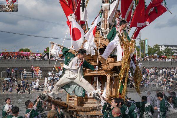 L’un des bénévoles ira jusqu’à s’essayer à quelques jeux d’équilibristes sur les « barres » des porteurs pendant que ces derniers l’agitent de tous les côtés. Un autre s’éloignera avec le courant pour discuter avec un camarade juché sur la rive, sa tunique relevée et collante laissant deviner un gigantesque tatouage dans son dos — et donc son appartenance à la mafia japonaise.