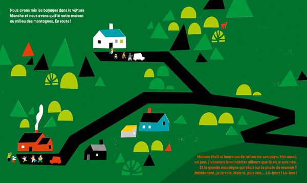 Petite spécificité de cette œuvre : elle se lit dans les deux sens ! Cela permet d’offrir deux histoires en une avec utilisant une même trame. Dans cette histoire, nous suivons dès lors les aventures d’un petit garçon ou d’une petite fille, tantôt dans une voiture blanche, tantôt dans un véhicule rouge, qui passent de la montagne à la mer ou de la mer à la montagne, selon comment le livre sera ouvert par les lecteurs (et curieux spectateurs) !