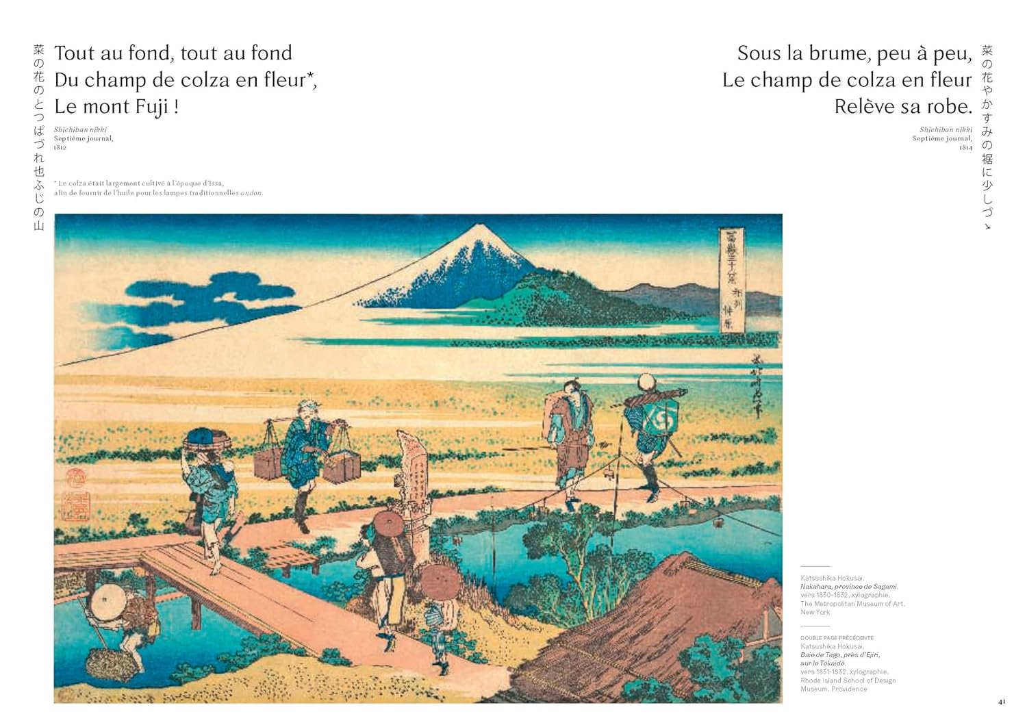 Les 100 haïkus présents dans l’ouvrage sont sublimés par des estampes, des dessins à l’encre ou des photographies, associations rendant l’expérience immersive. Pour chaque haïku, vous trouverez le texte original en japonais, sa traduction et, pour ceux qui le nécessitent, quelques informations culturelles à connaître pour appréhender correctement le vers de l’auteur.