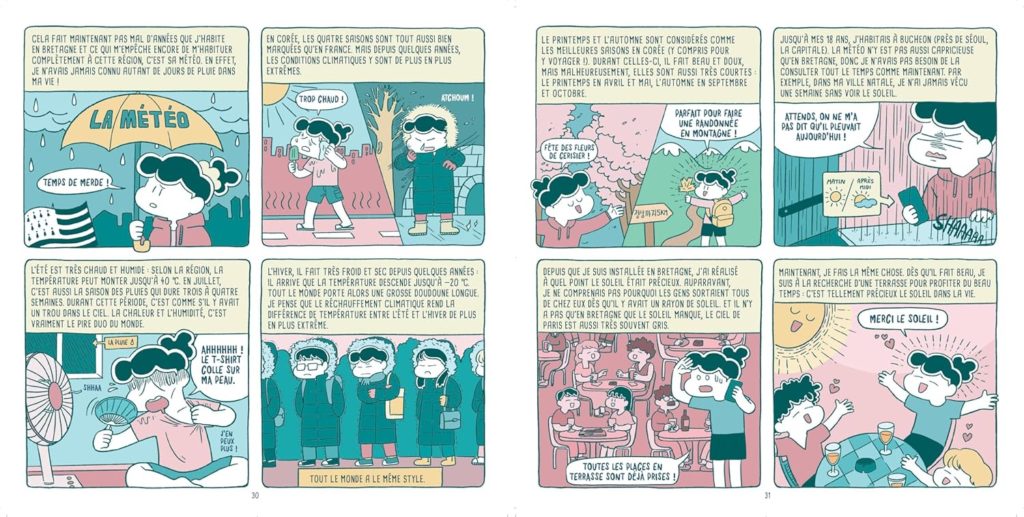 Narrée dans une trentaine d’épisodes BD, la vie de Yoon Yves en France semble bien loin de sa Corée natale. Entre différence de traditions culinaires et règles de vie bien distinctes, la jeune autrice illustratrice originaire de Corée du Sud nous raconte au détour de ses aventures en France, et plus particulièrement en Bretagne, les différences notables qui ont marqué à jamais sa vie de baroudeuse. C’est aussi l’occasion pour elle de nous faire découvrir à travers la douceur et le punch de ses illustrations la Corée comme nous ne la connaissons pas encore !